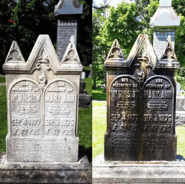 Do not power wash your gravestones. Let me repeat. Do Not Power Wash Your Gravestones. Power washing of any kind removes the outer layer of the stone while it ‘cleans’, which will make it look pretty for a small amount of time, but ultimately will cause the stone to weather even quicker and be gone even faster. Instead, try just using water and a soft brush made of natural or synthetic fibres (no metal!!) to clean the stone. This will often do the trick, but if you find you need a little more help, using a PH balanced cleaner such as D/2 Biological Solutions which is safe for stone cleaning as it does not deposit salts or acids in the stone, mixed with water will do absolute wonders. This is the cleaner that the Smithsonian Institute uses for their stone monument and buildings cleaning and care. Water and a substance like D/2 are the only materials you should be introducing to a stone for cleaning.