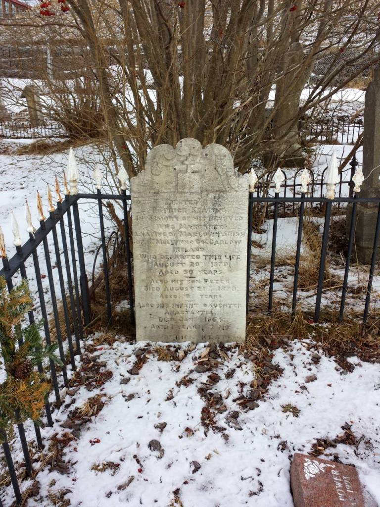 Marble headstone, 1879, in the snow at Belvedere Roman Catholic Cemetery, St. John’s, Newfoundland.