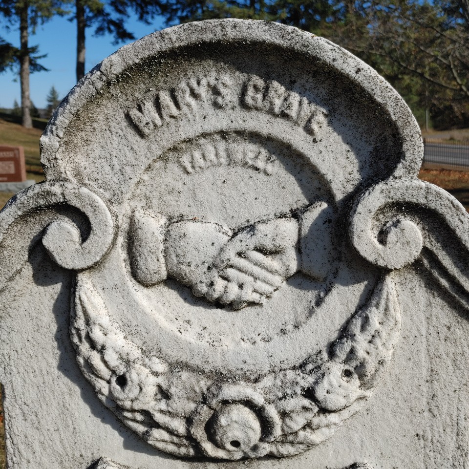Although we did not identify any gravestones that dated to the earliest use of the site (this is not unusual at all), we found many examples from the 1850s! Since I’m currently used to SW Ontario, the plethora of earlier dates was exciting to see. Below is a pair of unique gravestones that I was particularly interested in. One is a diminutive broken column, but curiously a square column, which is quite unique to my experience, and the other is a lovely and well preserved marble gravestone from the 1870s. I was very interested in this stone because of the inscription at the top of the lunette, which reads ‘MARY’S GRAVE / FAREWELL’.