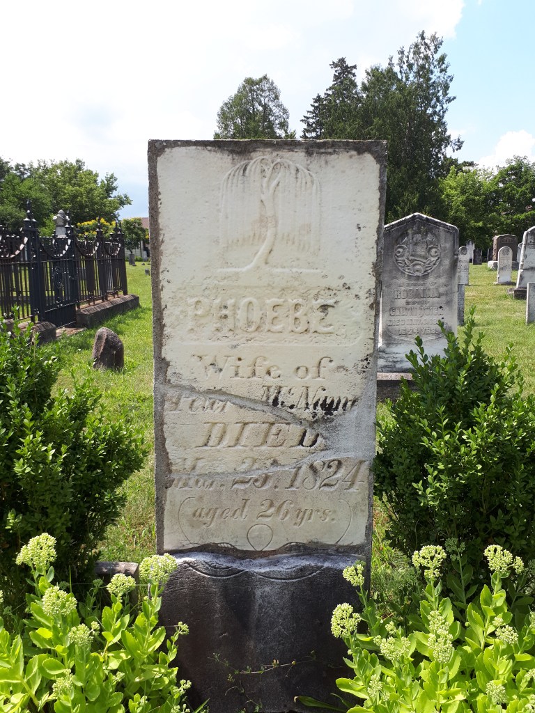 Gravestone of Pheobe McNames at Brickstreet Cemetery, London, Ontario, set in concrete and reset standing upright.