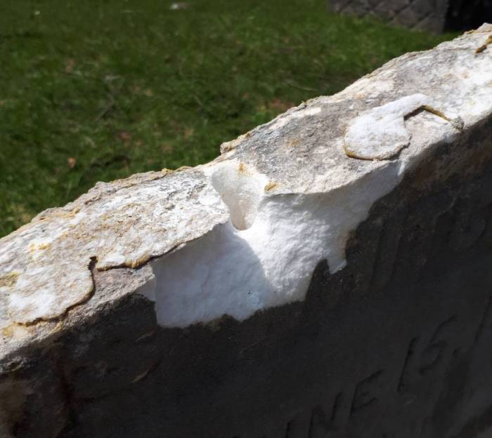One of the struggles with gravestone conservation (& preservation, I know I use these words interchangeably*) is the amount of information readily available online that is out of date. I won’t say misinformation, since this info was at one time thought to be fine, but we now know better. Practices like gravestone rubbings, using powders on stones, and repairs with iron and concrete are now known to be irreversible and cause long-term to the gravestones which ultimately cause them to fall apart faster than they would have if nothing had been done. This is a huge problem for volunteer groups who might not have access to academic conservation data, but can easily google and find someone saying its ok to rub flour into a gravestone to make it easier to read (it isn’t ok!)