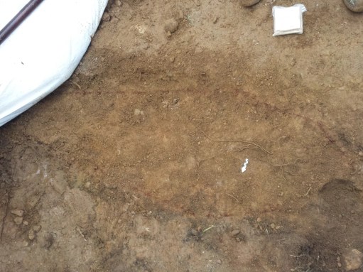 In the archaeological record, coffins survive to varying degrees, dependent on the environment where they are buried, the acidity or moisture content of the soil, the materials they are made of, and many other variables. In Newfoundland, coffin material of settler graves often don’t survive well, even from the later 19th century, due to the high acidity of the soil. You can see in the image here that the outline of a hexagonal coffin is visible, but only as a soil stain. This means that the coffin wood itself has decomposed and changed the composition and colour of the soil where the wood once had been. What we can tell about a coffin in this state of degradation is its shape, and the orientation of the nails, which were preserved as mostly iron lumps, but which gave clues about the construction of the coffin itself.