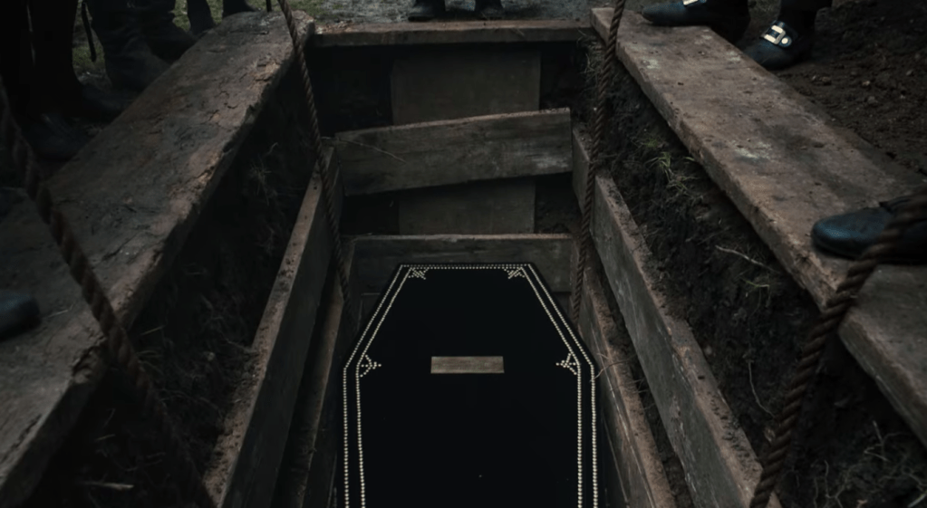 This is just going to be a short post, to point out a few things that my death scholar friends probably also got pretty excited about seeing on their tv screens. The funeral was being held for Horace, father of the main character, James Delaney. We see a funeral procession all in black: horses with mourning garb and black ostrich plumbs on top of their bridles. The horse-drawn hearse crosses a bridge with the funeral party behind them is portrayed fairly accurately (though I am not a 19th century funeral expert, please direct specific questions to Dr. Obrien on twitter @drdan_o). As you can see below on the example undertaker’s card from the National Funeral Museum collection, run by T. Cribb & Sons, London, UK, which dates from 1800-1810, a funeral procession complete with horses and decorated hearse moce across the bottom of the card.