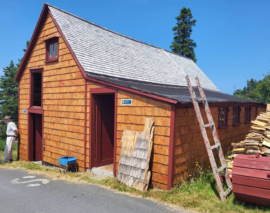 Months ago I was contacted by Heritage NL about this property, as Dale Jarvis and Maryssa Barris had identified a large hexfoil on the second storey of the stable and store. The beautiful one and one-half store wood shingle sided structure with a shed-roof store addition on the east facade stands closest to the road of the complex. In 2015, the complex underwent a much needed restoration, and a portion of the original shingle siding can be seen leaning against the restored exterior in the photo to the right. According to the HeritageNL report, linked below, the original shingles included red ochre for colouring.