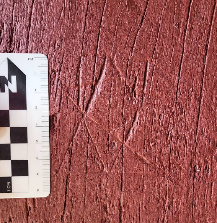 What a difference a little light makes, and why I always recommend the use of a bright flashlight when you’re trying to read a weathered gravestone inscription! The large hexfoil was very exciting, and the first example of a graffitied hexfoil I’ve seen in a domestic building in Newfoundland as well (if you know of any others, please let me know). You can clearly see the divot in the centre where the one point of the compass was stuck to draw the external circle, and based on the way the external point used to draw pulled at the wood fibres, it is evident that the exterior circle was drawn counter clockwise. I’ll include a close-up of that further down in this post! Closer to the window was the other large circle, also pictured in the grid below. It’s much fainter and doesn’t have the internal hexfoil, but because we know that circles were often drawn as protective graffiti in the same manner as hexfoils, especially in the UK, it is very likely that this circle was put here purposefully as well.