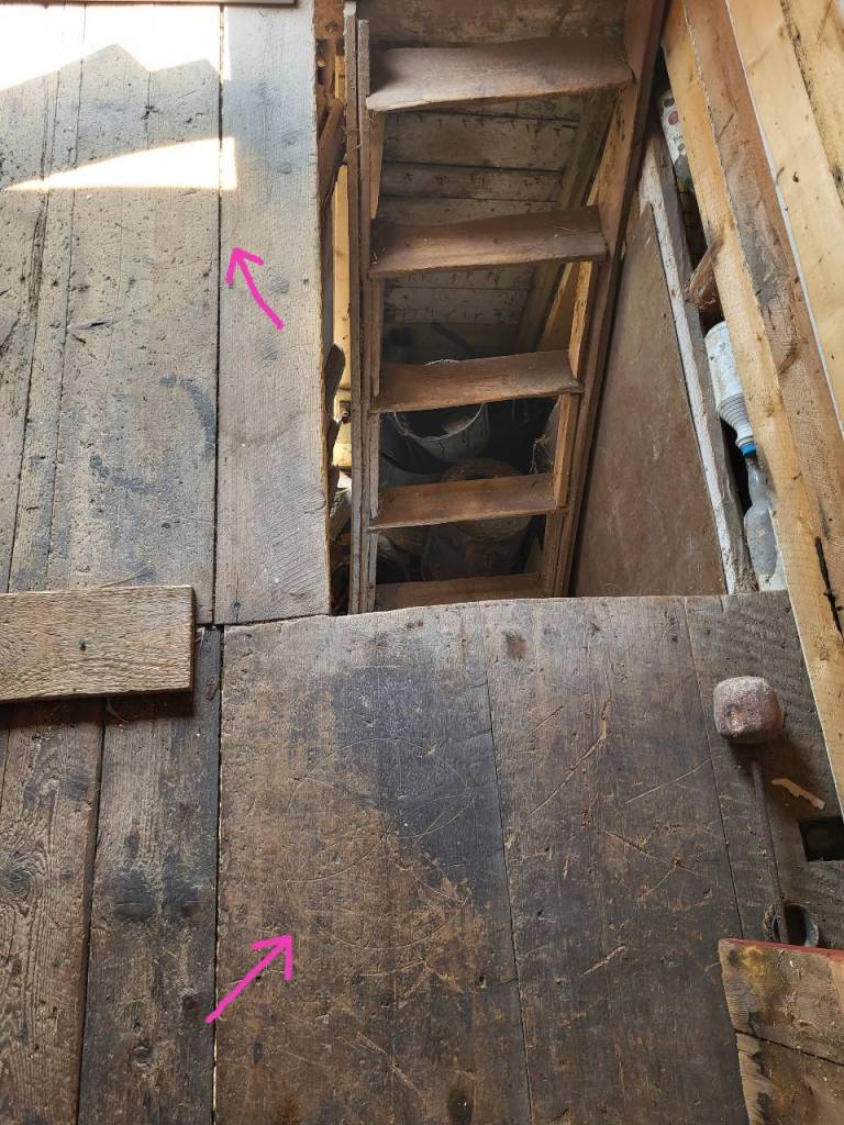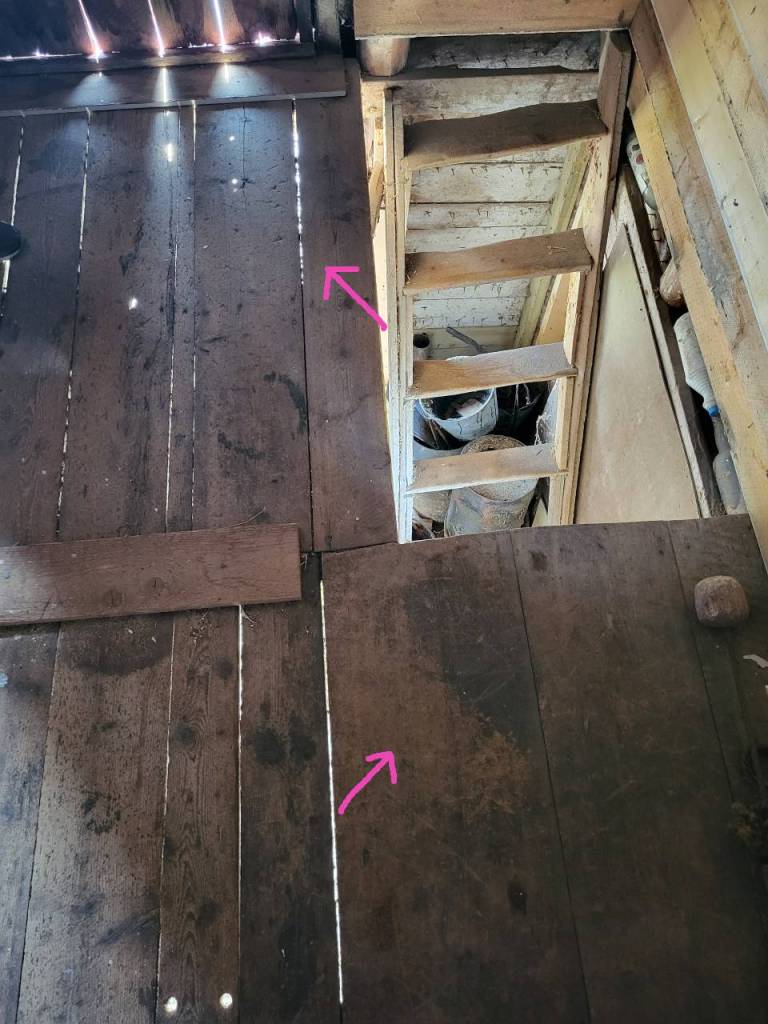 One of the trades that the Burgess family partook in was as coopers, or barrel makers. Using large wood and metal compasses, they would trace out the patterns on timber cut across the path in their saw mill to build barrels on the property. When Maryssa and Dale were there recording the site for the recent report (found here), Bob Burgess opened the panel blocking light from the upper doorway on the front of the building, flooding the loft with natural light. Suddenly, two circles were illuminated in the light, on either side of the ladder opening to the stable below. To the right of the opening was a large circle, and on the bottom end of the opening was a large hexfoil of the same size. It is most likely that these were scratched into the flooring using one of the fixed-arm compasses that the Burgess family had on the property for coopering.