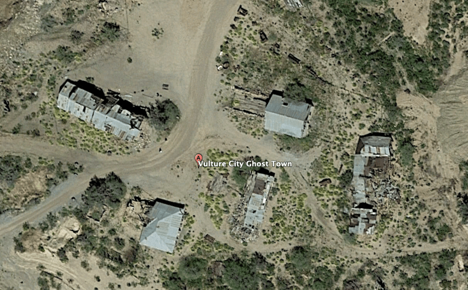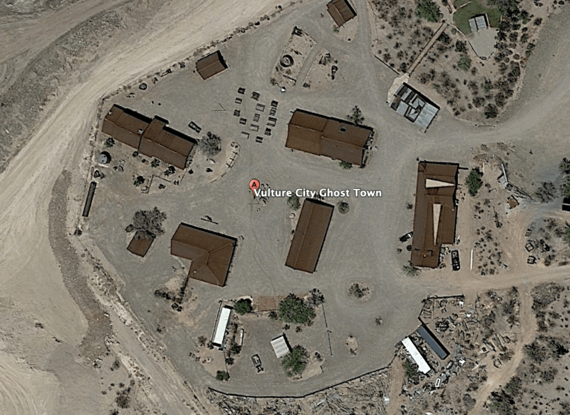 The heritage site managed to relocate and reconstruct one of the most important aspects of a mining operation like Vulture Mine, the headframe. A headframe for a mine is a large structural component which would be used to haul mine carts, materials, and sometimes personnel out of the mine. As you can see in the 2013 image below, it was previously located to the south of one of the depressions that was once a mine, with a structure to the west that once housed a forge for machinery parts and repairs. By 2017 the encroaching modern mine and the push to restore the site meant that the headframe and forge would have to be moved, and were relocated to near the town centre by late 2017. This was clear through the aerial images available publicly through Google Earth! It’s so cool that you can use these tools available to everyone to trace the restoration efforts of historic sites. It’s a little bit of historic and industrial archaeology for you, too!