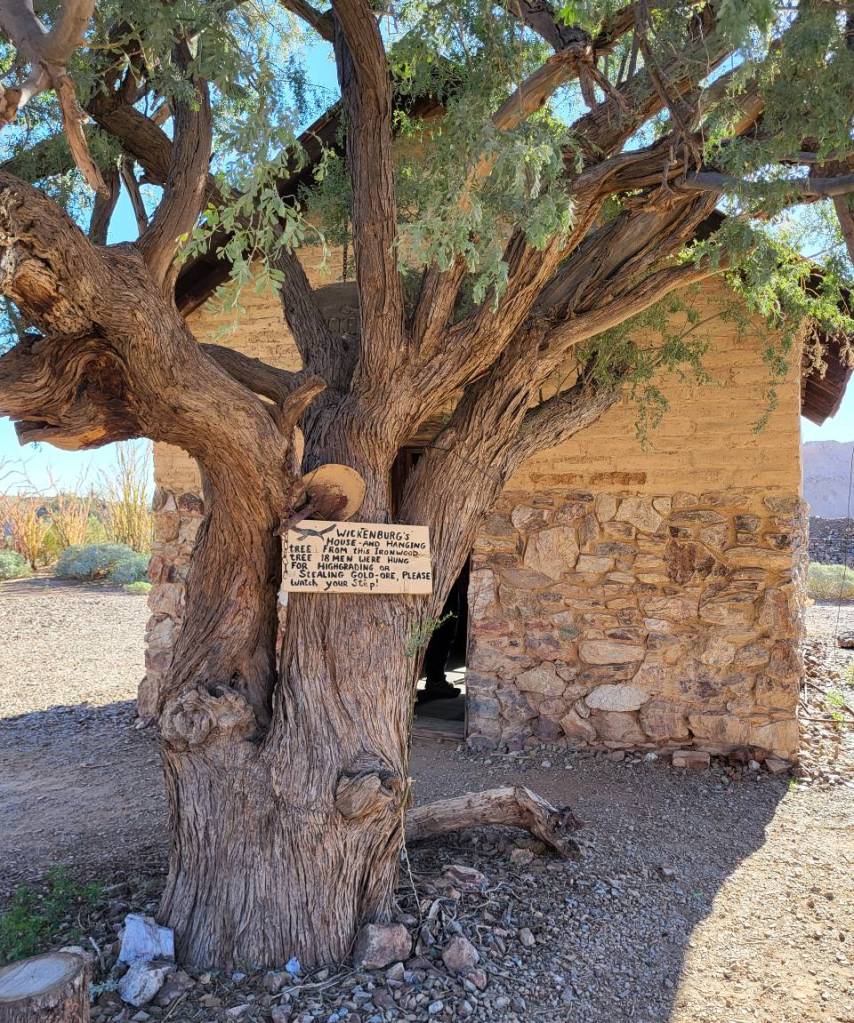 Vulture City is a really amazing site, and I totally recommend visiting them (and donating to its restoration if you can)! We first heard of the site through Buzzfeed Unsolved, who visited in 2017 prior to the restoration of a number of the buildings. They visited before the modern mine spread over a large area of the property, and they were able to visit the unfortunately named ‘Glory Hole’, where a number of miners and donkeys died after a portion of the underground mining operation collapsed. Allegedly, they were sneaking in at night to mine out extra ore from the support pillars that…held up the mine…which seems like a very silly thing to do. Unfortunately because of the continued mining next door, we weren’t able to visit that portion of the site! We also saw two episodes of the infamous ‘Ghost Adventures’ where Zach Bagelbites..er..Baggins, and team visit the site and pick through the ruins of the Assay office and other buildings, yelling about bumps in the night and nearly getting washed away by a flash flood. Those episodes can be found in Season 3, Episode 1: Vulture Mine, and Season 21, Episode 8: Disturbed in Wickenburg. They were all very interested in the ‘hanging tree’ which stands just outside the home of Wickenburg himself.