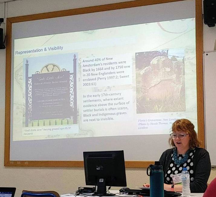 Conference day 4, or the one where I had to present! My talk was titled “Mortuary Landscapes and Cultural Representation in Burial Spaces, 17th- to early 18th-Century Northeast North America“, and covered some of my ongoing PhD research. So far, I’ve looked at the diaries of Samuel Sewall and Joshua Hempstead (click those names to read about the research!) to see how people in the later C17th and early C18th described funerals and burials, and to see how they represented the burials of Black and Indigenous people during the period as well. I am going on a research trip to New England and NY in a few weeks to continue this line of research, and I can’t wait to explore it further. For a grey afternoon on the last day of the conference, there was a very good turnout for the session, so a huge thank you to everyone that attended, and to my fellow presenters! Everyone’s talks were so cool! If you are interested in learning more about my research, please see the blog posts I linked earlier in this paragraph, or wait with bated breath for my dissertation, which I’ll be writing hard on come this Monday! After the conference was over, we spend the evening hanging out with April (@AprilMBeisaw) and Bill (@ArchaeologyGame), which was a wonderful way to round out the conference!
