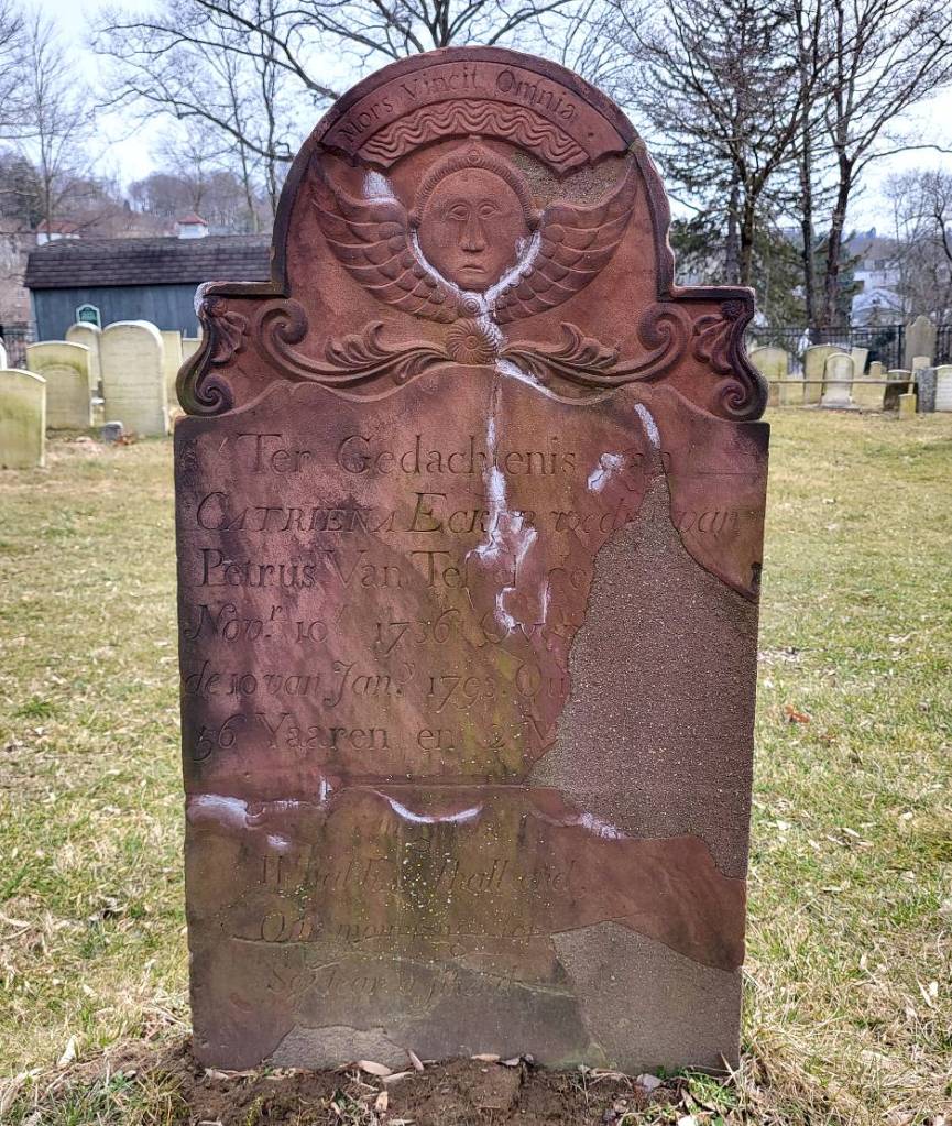 While the church itself was not constructed until the 1690s by Frederick Philipse, First Lord of Philipsborough Manor, he stated that there were at least 50 burials in the burial ground when construction started, and he had the church placed on the south end of the site (Greenwood 1976). While the British ruled the area from 1664, the settlement remained very Dutch in tradition and language, with Dutch being present on many of the gravestones at the burying ground. The gravestone pictured here, of Catriena Ecker Van Tassel, is thought to have been the namesake for Katrina Van Tassel in Irving’s story, and you can see how damaged the stone has become from years of gravestone rubbings. It was very interesting to see that stone in particular in person, as well as this site that has such legend behind it, but also such an early burial site in colonial Dutch North American history!