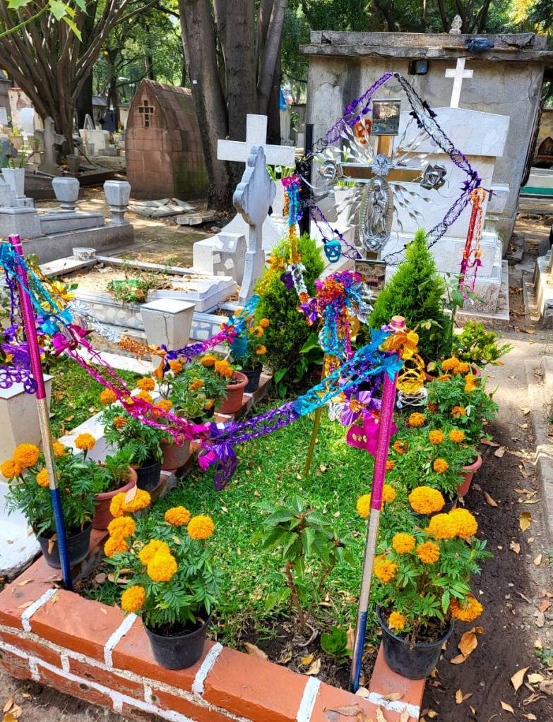 That same day, November 1st, is the day when the spirits of children and infants return. We visited a smaller cemetery, Panteón Xoco in Coyoacan, to take a look at some of the decorations, and saw families coming out to clean the gravestones of their relatives, pray by them, and decorate them for the holiday. Some had flowers, and some had elaborate decorations with flags, streamers, photos, and mini altars of food and drinks. There were even some with more ‘halloween’ decorations mixed in, little ghosts and bats, which was very interesting to see! There were several musical groups walking around as well, a mariachi band and two men with a huge marimba. Mariana told us that families will hire them to play a song for their relative, and the different types of bands were from northern or southern Mexico, so you could have music from where your family originated. It was really special to see, and I’m so glad we were able to visit and be part of the celebrations in some small way.