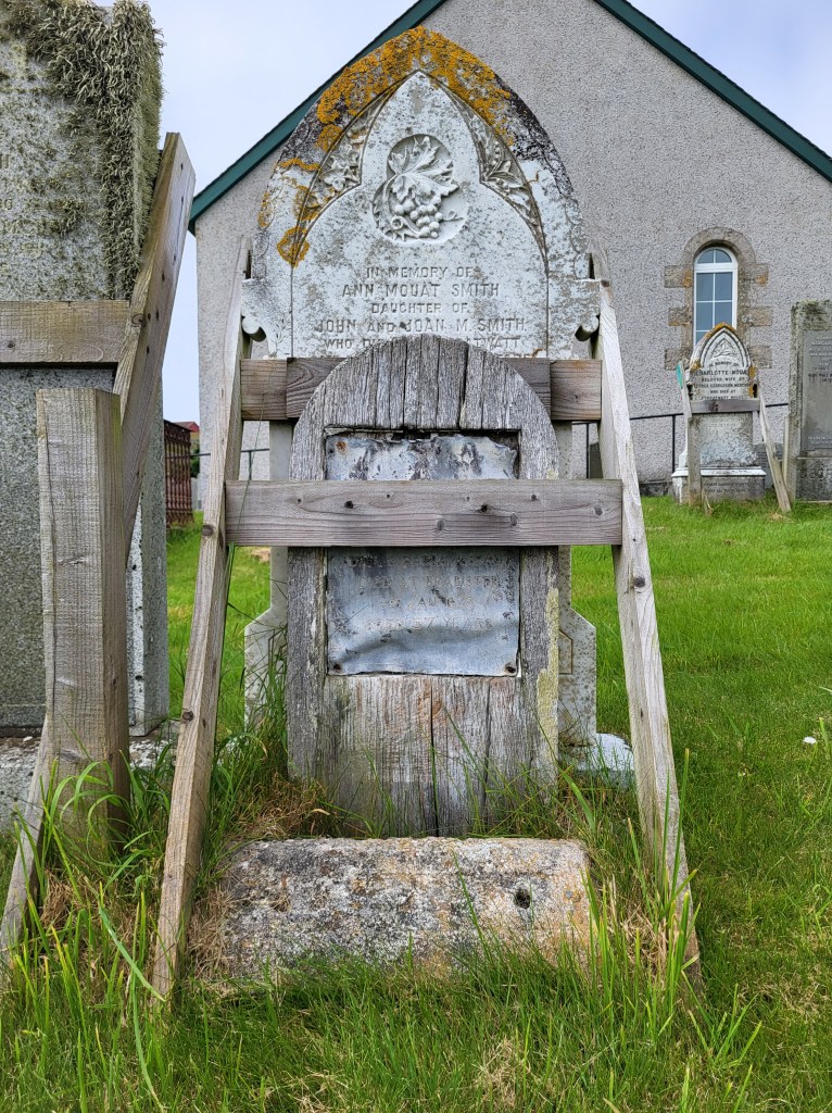 One of the first things we noticed in the first graveyard we visited in the village of Walls, where we were staying, was this very ingenious way of stabilising gravestones that were in need of conservation work. The markers that were at risk of falling had a wood frame built around them to lean on, without putting any metal in contact with the stone itself, which would lead to staining. The angled posts were then attached to posts driven into the ground away from the stone to give support in the direction it was leaning. Each one of these markers had a little tags on the site, or on the ground in front, which read,