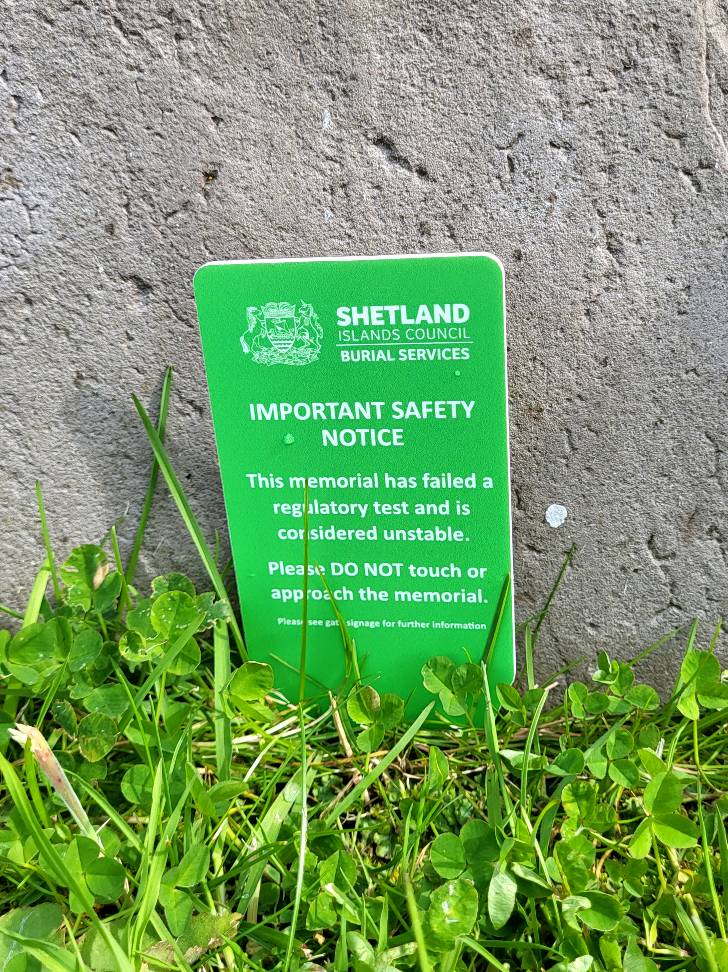 “Shetland Islands Council Burial Services, Important Safety Notice: This memorial has failed a regulatory test and in considered unstable. Please Do Not touch or approach the memorial”