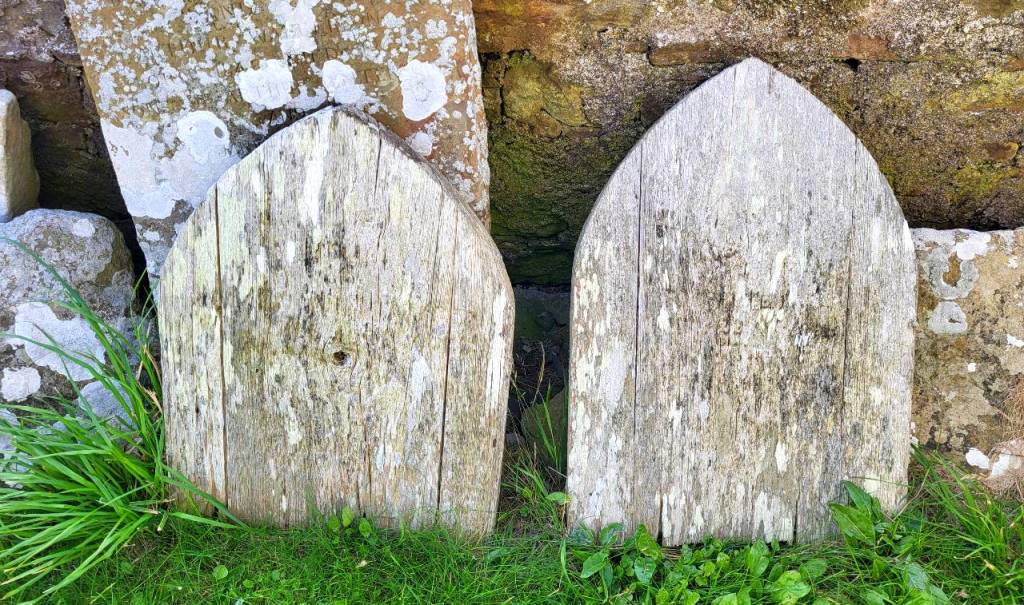Two wooden grave markers on the side of a church on Orkney Mainland.