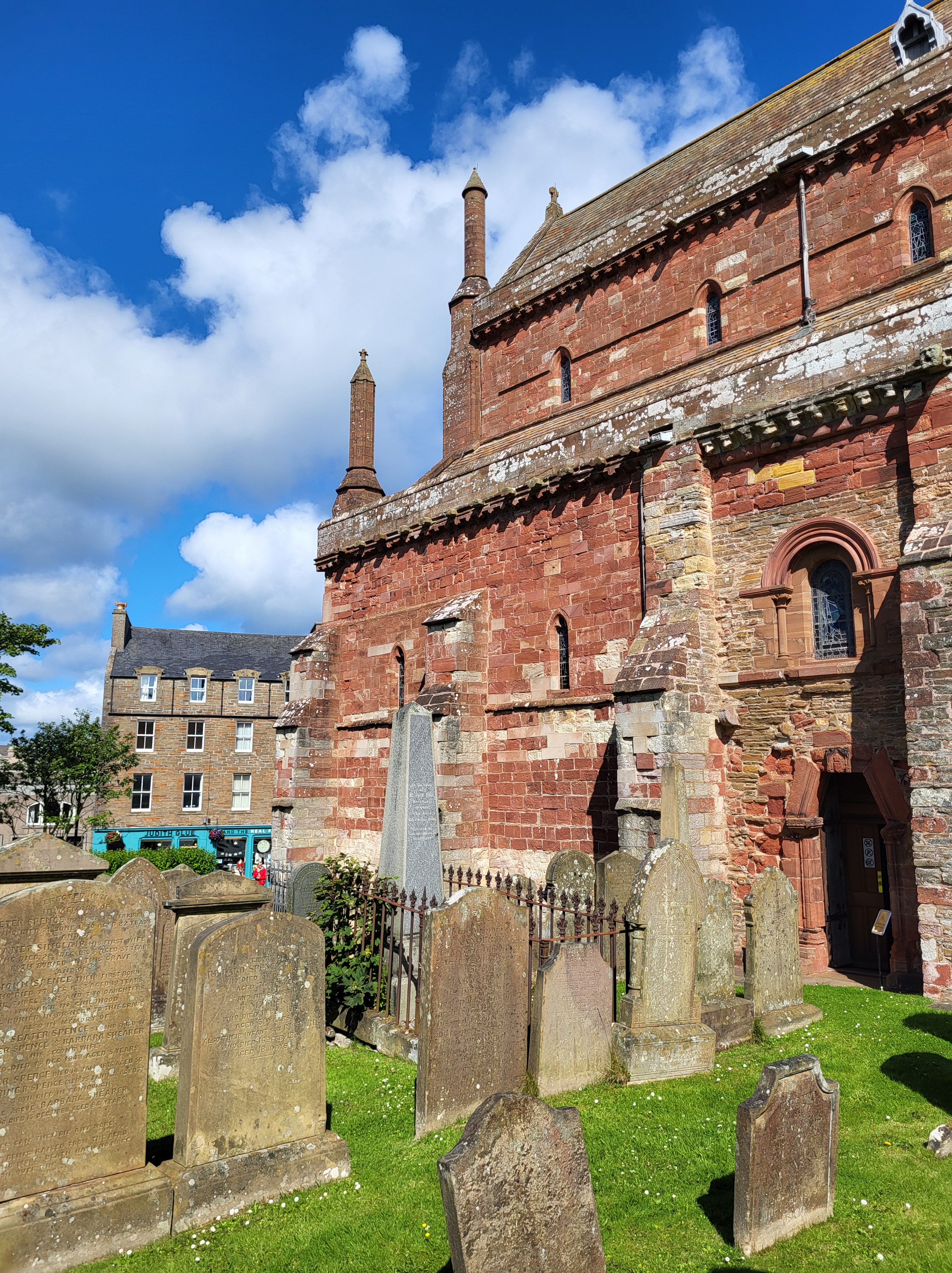 The centre photo above is me posing with a grave slab that was recovered the floor of the building, and was made in the 13th century. It’s the oldest surviving burial marker at the site, and shows a deeply incised decorative hexfoil on staff and stepped base, with a sword beside it, and the letters P and S in the top corners. I was very excited to see this marker again! The cathedral also has one known graffitied hexfoil. And finally on the left is a portion of the churchyard and the gorgeous red and yellow sandstone that makes up the cathedral walls. It really is such a striking site!