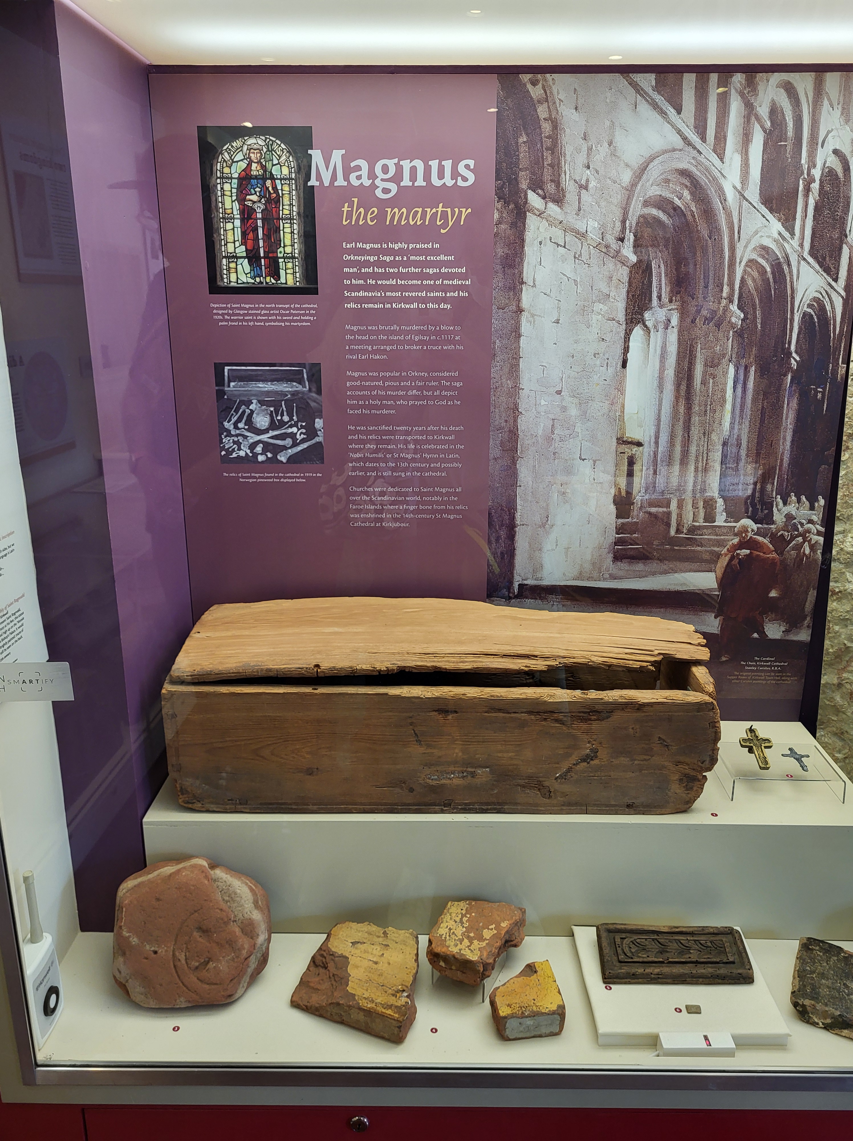I’ve got a variety of mortuary archaeology related photos below to finish off this summary of our trip! They are all associated with the St. Magnus Cathedral. The cathedral was constructed in the 12th century when the Norse had control of the Orkney and Shetland Islands, and was named after Magnus Erlandsson, Earl of Orkney, who was ultimately killed by his cousin, and was later sanctified, becoming St. Magnus after death. During a period of restoration work in the cathedral in 1919, a wood box (pictured below), was discovered hidden inside one of the stone pillars, containing the relics of St. Magnus who had been moved from his original burial place when the cathedral was being constructed. The box now resides in the Orkney Museum across the street from the cathedral, but his remains are still within the pillar, marked with a cross.