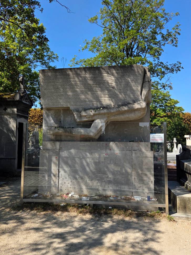 It was 27.C while we were at the cemetery, but the trees throughout the site really saved us! Our first stop was Oscar Wilde’s grave, which is a stunning winged male figure in a sort of an art deco style, by sculptor Jacob Epstein. The cemetery had to put plexiglass wall around the grave to keep people from kissing it with lipstick on, as it was damaging the stone! As a gravestone conservator, I approve of this measure, the oils aren’t good for stonework at all. It was so amazing to visit the grave of such a significant literary figure! We had a wonderful time peeking into the family tombs, which were primarily little chapels, and the actual burials were below the structures.