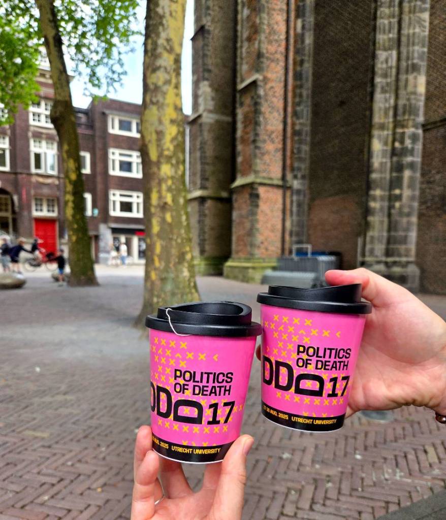 The spaces at the University of Utrecht where the conference was held were wonderful, and I was really happy that we had the opportunity to travel to the Netherlands for this event! The conference had several sessions running at the same time across a few locations at the university, which all surrounded the famous Domtoren. The conference hub had a coffee station, artworks by Charles Clary on display, and a book room! Did I end up bringing seven or eight books home with me after the trip? Possibly. Did Ian offer me room in his suitcase for my books? Also yes! Titles I picked up included: ‘American Afterlife’ by Shannon Lee Dawdy, ‘On Grief and Studio Ghibli’ by Karl Thomas Smith, and ‘A Companion to Death, Burial, and Remembrance in Late Medieval and Early Modern Europe, C. 1300-1700’ edited by Philip Booth and Elizabeth Tingle.