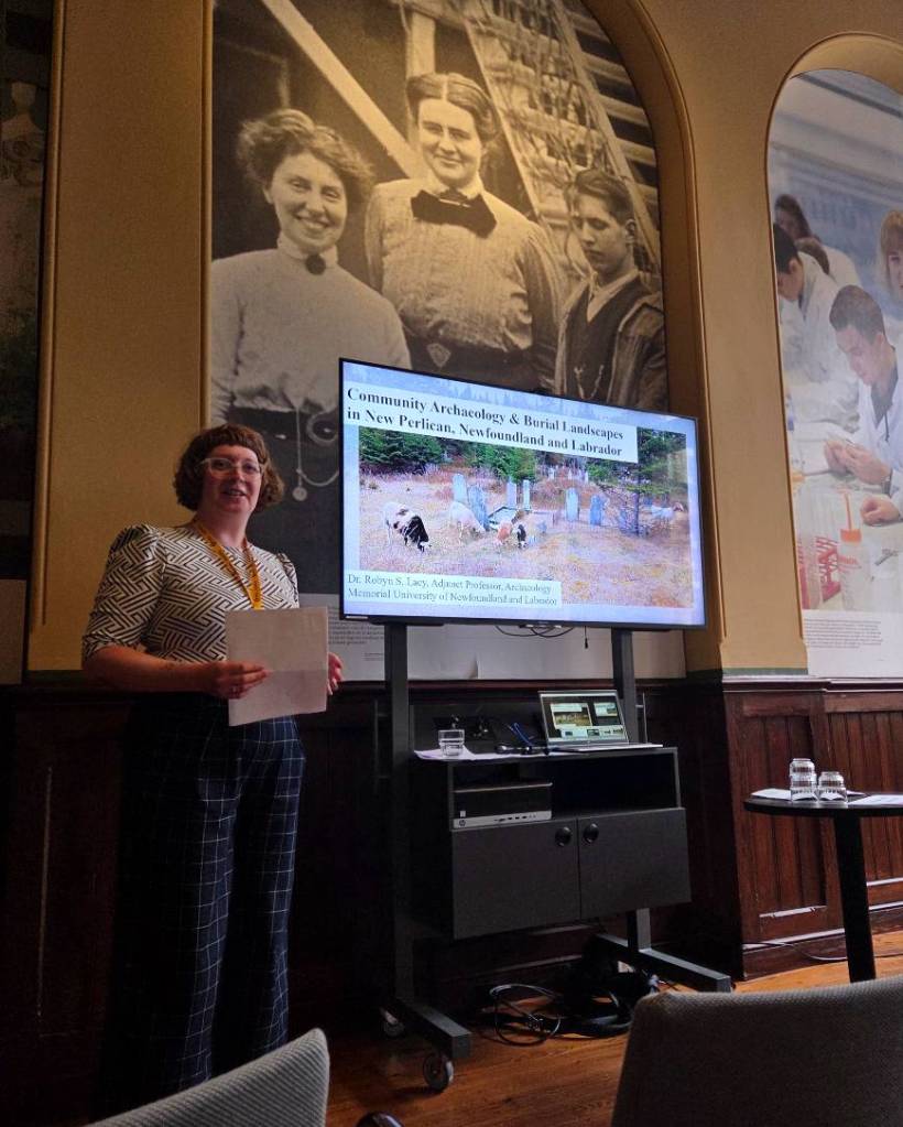 I don’t have any photos of the talk, but Ian and I also gave a talk about working with community heritage groups as gravestone conservators in Newfoundland and Labrador. We were able to include some examples from our project in Battle Harbour from this summer, working with the Battle Harbour Historic Trust, as well as some of our longterm projects such as Greenspond and Trinity. We had some interesting questions, and it was really cool to be able to present work we are doing in Newfoundland to researchers from around the world. Thank you to everyone who came to our talks!
